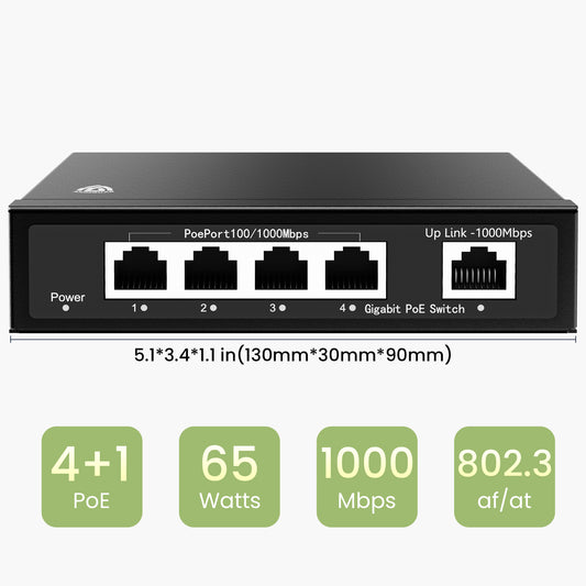 4 Port Gigabit PoE Switch with a Uplink Gigabit Port, 1000 Mbps Unmanaged Ethernet Switch with 65W Total Power, Metal Casing, Plug and Play, Desktop or Wall-Mount