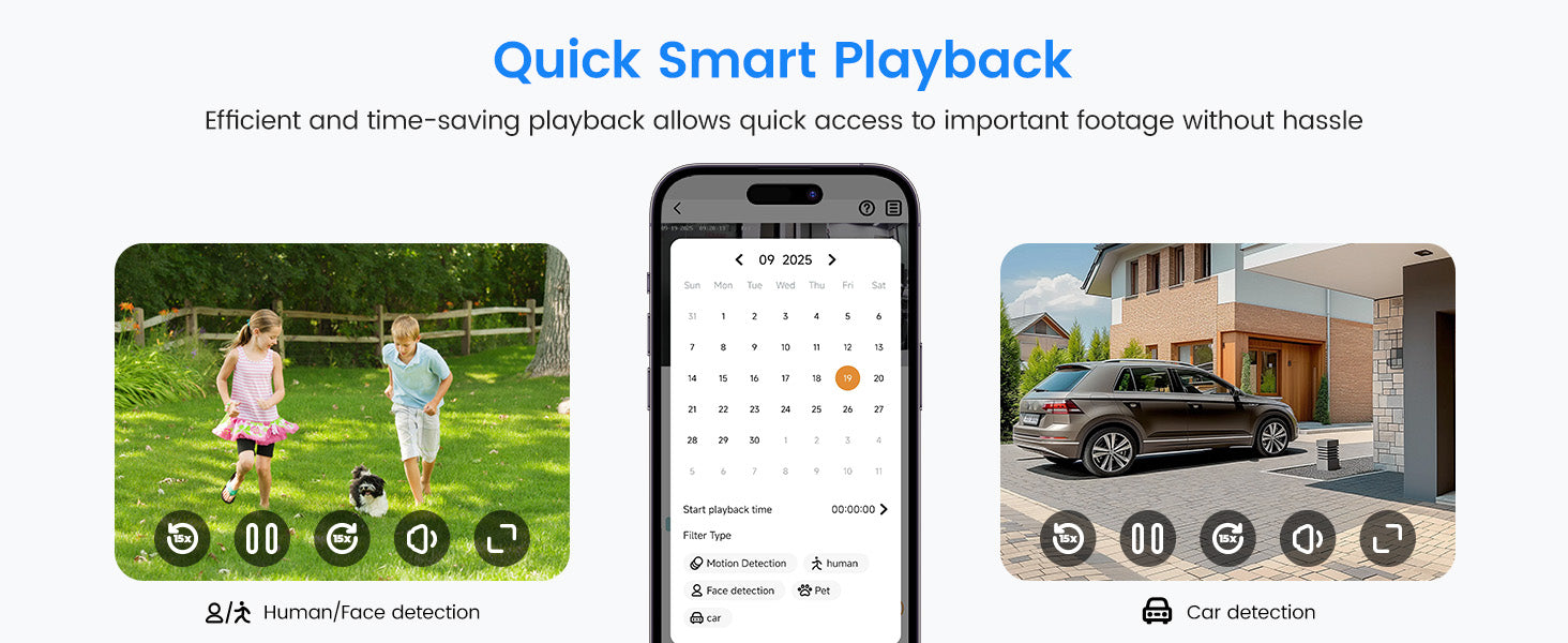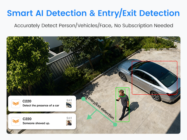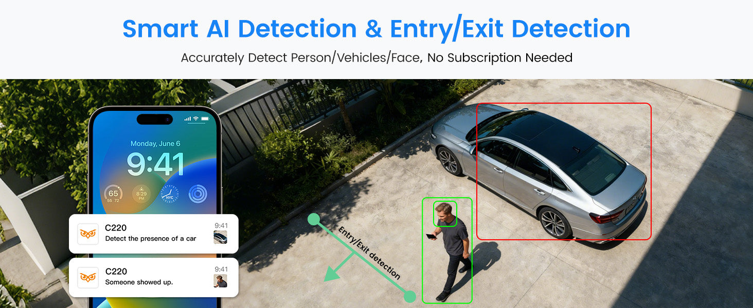 - 🤖 【Smart AI Detection – No False Alerts & No Monthly Fees! 】Our advanced AI knows the difference between people, cars, and false triggers. Get instant phone alerts only when it matters. Plus, use two-way audio to speak directly through the camera—deter intruders or greet visitors from anywhere.